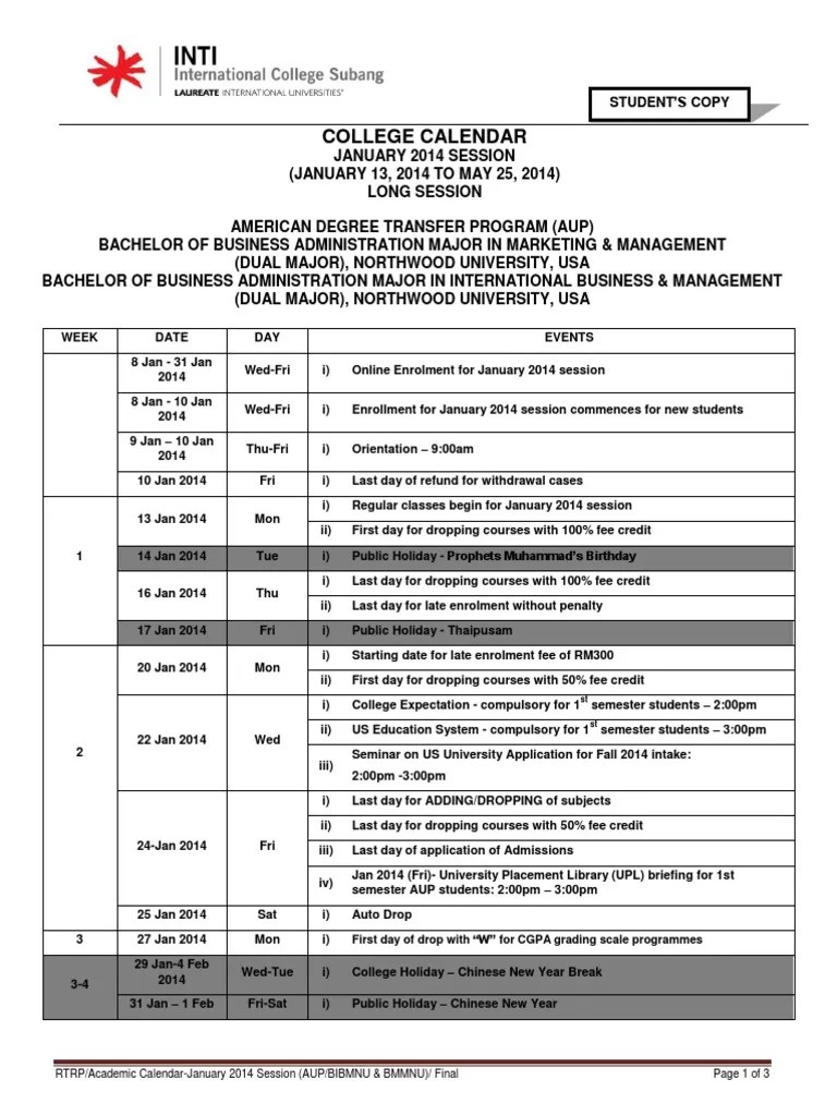College Calendar AUPNU Jan 2014 (Final)_student Academic Term Academia