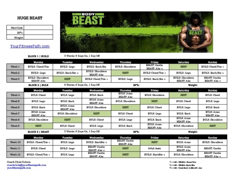 Burn fat, carve lean defined muscle, and transform your body with body beast. You can download any of these workout schedules, worksheets, calendars below and save them to your computer for using/printing. Learn the best body beast schedule for you to use. Body beast was created by sagi a.