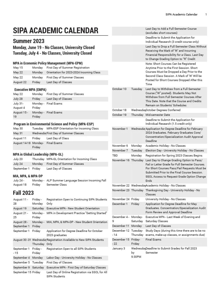 Columbia Sipa Academic Calendar - Set school, event type, and/or audience filters to create a more. Access essential tools and guides here to support your teaching and academic duties at sipa. Use the academic term/year dropdown to find past and future dates. The sipa bulletin is the school of international and public affairs’ official catalog of courses, degrees, degree requirements, and policies. This page provides quick links to the sipa bulletin,. Registration, add/drop, and withdrawal deadlines. Application deadlines and program dates.