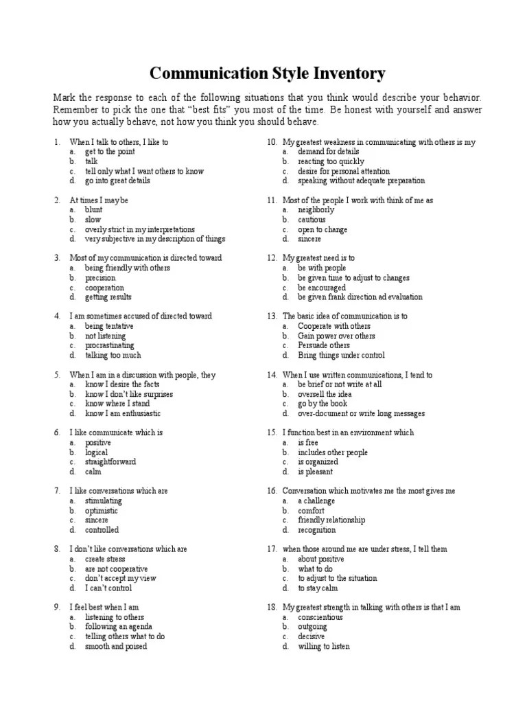 Communication Style Quiz Printable - Web a description of the 4 communication styles, how to communicate with each one and a short quiz to determine which one you have. Circle the items you have selected and add up the totals. Take our quiz to find out find out whether you’re an influencer, dominant, conscientious, or steady. Get the practical and simple design tricks to take your slides from “meh” to “stunning”! Do you know what’s at the root of a lot of workplace conflicts? Web this questionnaire is designed to help you discover your preferred communication style(s). Web scoring sheet for the communication styles assessment instructions: Web research and assessment identifies four different communication styles based on levels of emotion and linearity in how we. Web circle the items you have selected in each row and add up the totals for each style (one point per answer). Web do you know your communication style at work?