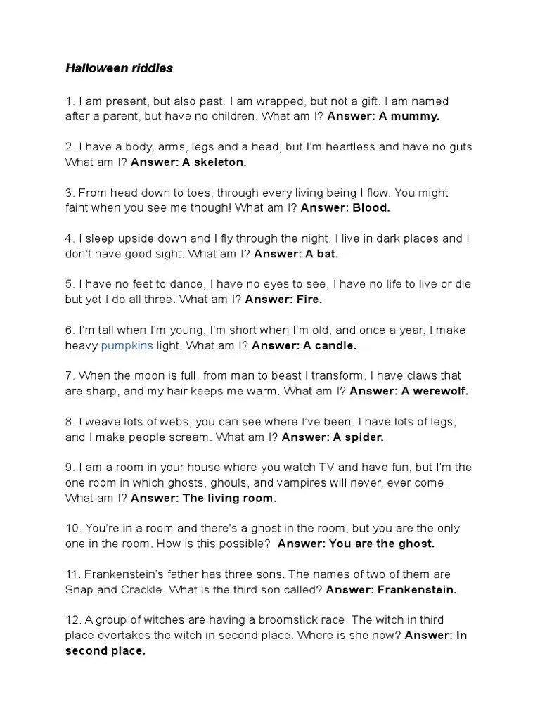 Web 31 halloween riddles and jokes for kids to solve. Entertain your classmates or share these halloween riddles for kids. Web incorporate the riddles into your halloween game night, giving guests a chance to guess answers. Halloween night or all hallows' eve halloween party riddles or use them for a tickle your funny. These 75 halloween riddles with. Web these halloween riddles for kids and adults will get you in the spooky spirit. Web these are the best halloween riddles, jokes, and brain teasers for kids and adults. The pdf file contains four pages. You can purchase these fun riddles pdf download for $5.00. Web purchase the halloween riddles pdf download. If you’re not a fan of the spooky ghost stories that get told. Web tricky halloween riddles. Web riddles are a great activity for kids, because they help to exercise their brain while also having fun.if your kids are.