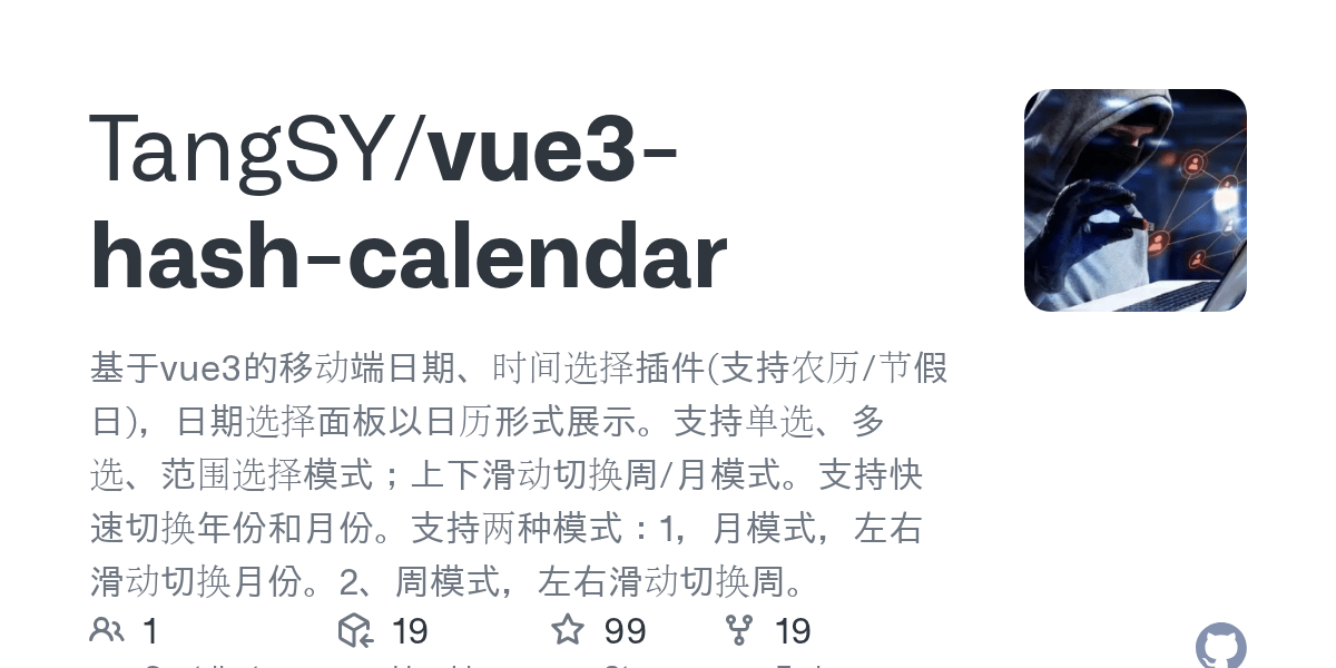 GitHub TangSY/vuehashcalendar 移动端日期、时间选择插件,日期选择面板以日历形式展示。上下滑动切换周/月模式。支持快速切换年份和月份。支持两种模式:1,月