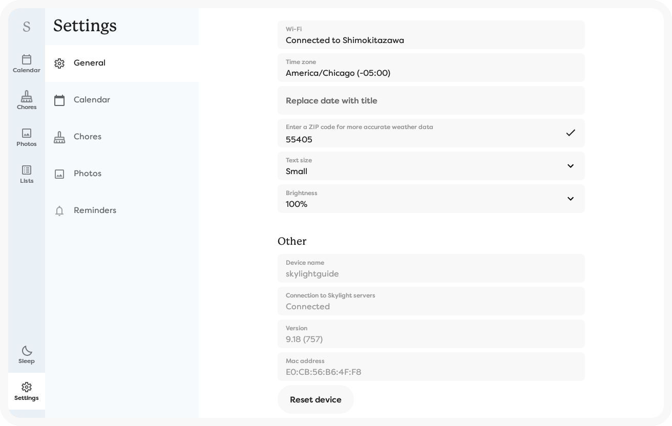This is a place to discuss all things skylight. Tips, tricks, hacks, problems, etc. Start by clicking the settings logo in the bottom left corner of the skylight calendar. Press reset device at the bottom. Tap settings in the bottom of the sidebar.