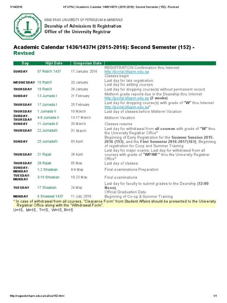 KFUPM Academic Calendar 1436 1437H (20152016) Second Semester (152) Revised PDF