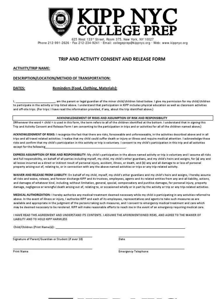 KIPP NYC College Prep Permission Slip PDF Wellness Medical