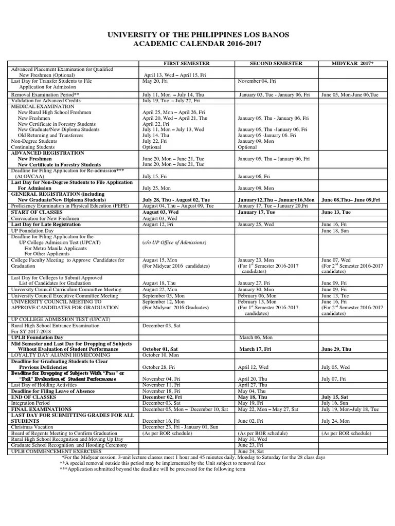 University of The Philippines Los Banos ACADEMIC CALENDAR 20162017 PDF