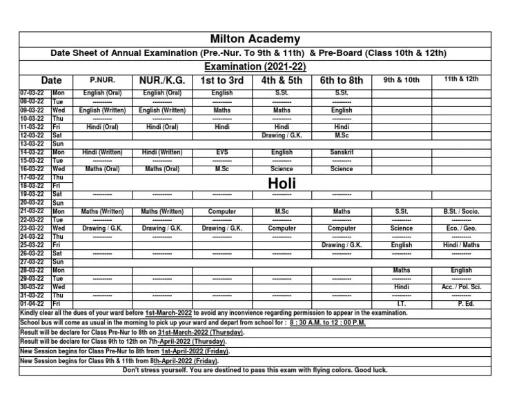 Milton Academy Annual Examination Date Sheet 20212022 Exam Schedule