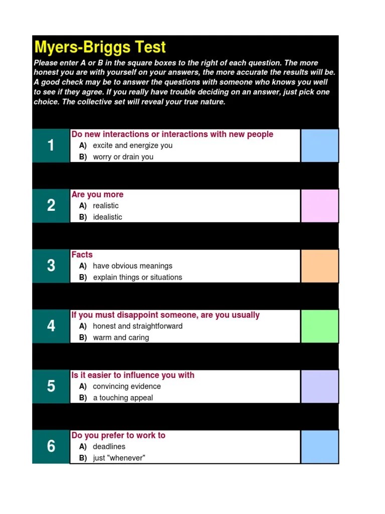 Myers Briggs Test Printable - Web discover the 16 personalities created by myers & briggs, test your personality type, and find your strengths. Learn how your personality type. Web discover your personality type and learn how it affects your relationships, career, and life choices. Be yourself and answer honestly to find out your personality type. Take a free, quick, and accurate. To take the personality test, mark. Expend energy, enjoy groups or b.