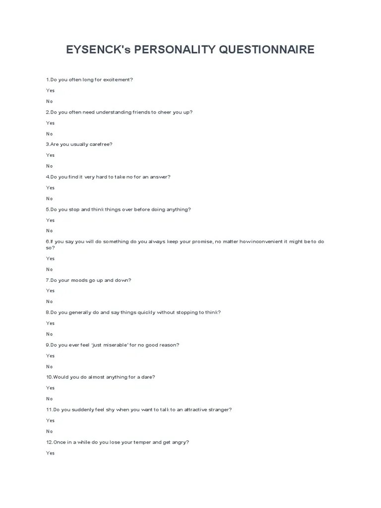 The test is designed with intuitive navigation that guides you through a series of. Download this personality questionnaire so clients can better understand their personality traits. Discover your core personality traits with the free eysenck personality questionnaire (epq). Taking our free printable personality test is easy and secure.