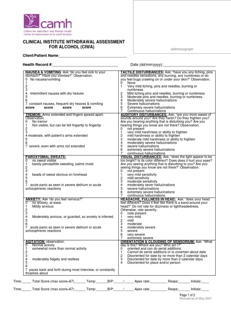 Printable Nursing Ciwa Scale - Patients with alcohol withdrawal and clear.