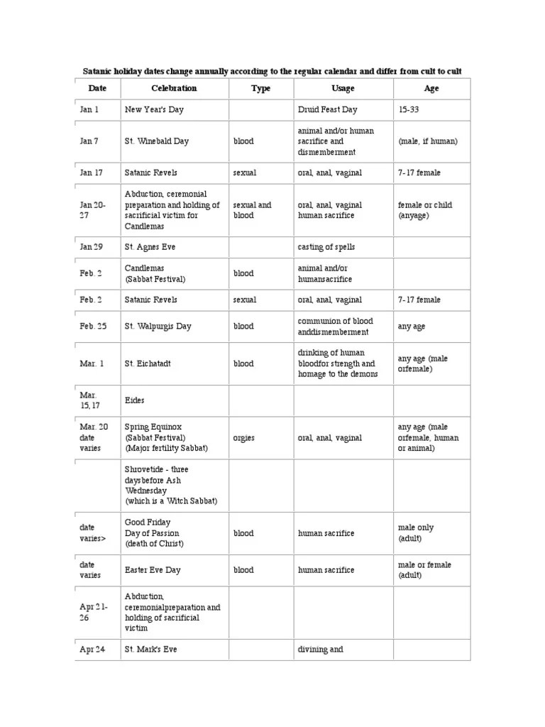 Life is awakening in spring and so during spring the moment is celebrated. It usually involves the member or a victim of the member’s choice and someone in authority, usually the coven’s leader. The first and third of every month. Web 44 rows satanic holiday dates change annually according to the regular calendar and differ from cult to cult. It.