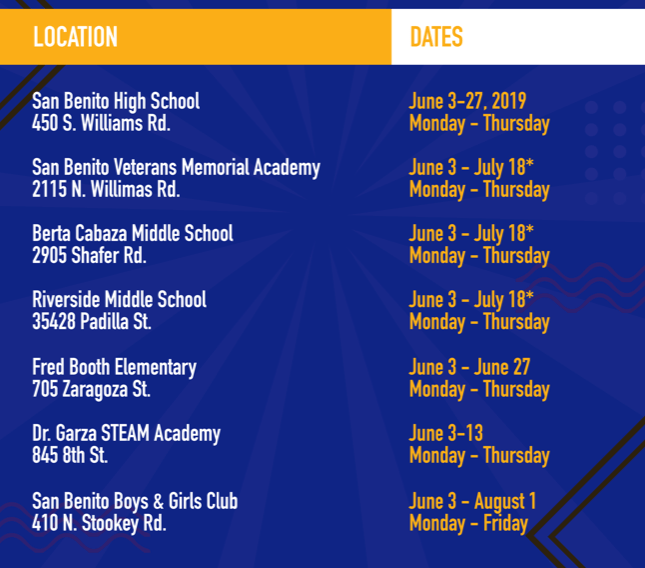 2019 summer feeding site schedule San Benito Consolidated Independent School District