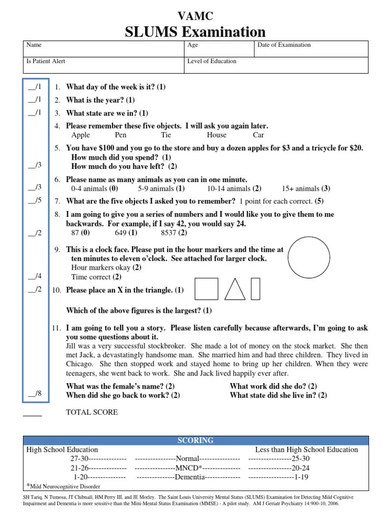 It is free to use by health. If a patient of yours is exhibiting signs of cognitive decline or dementia, conduct the slums test to examine them. The slums test is a screening tool that may identify signs of cognitive impairment. The saint louis university mental status (slums) examination for detecting mild cognitive impairment and dementia is more sensitive. Slums.