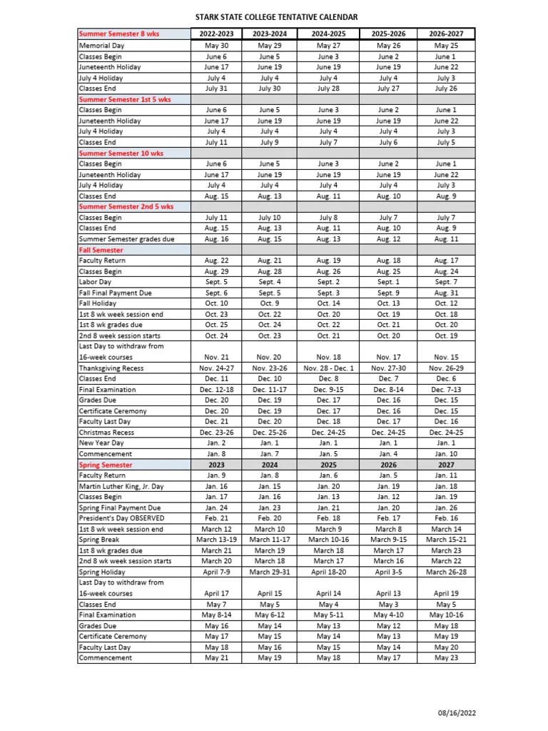 Academic calendars including spring, fall and summer calendar with printable pdfs. It’s free massage break tuesday!! It includes important dates such as class. Under ohio revised code (section 124.19), no other holidays are moveable. Stark state college is a community college offering affordable and transferable education.